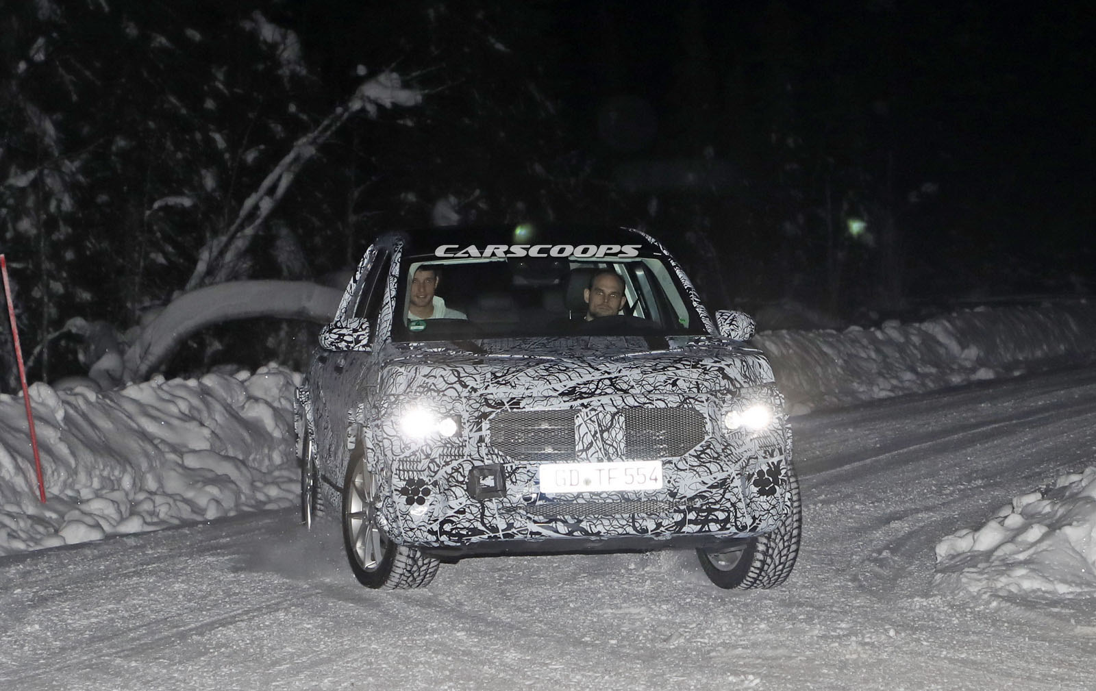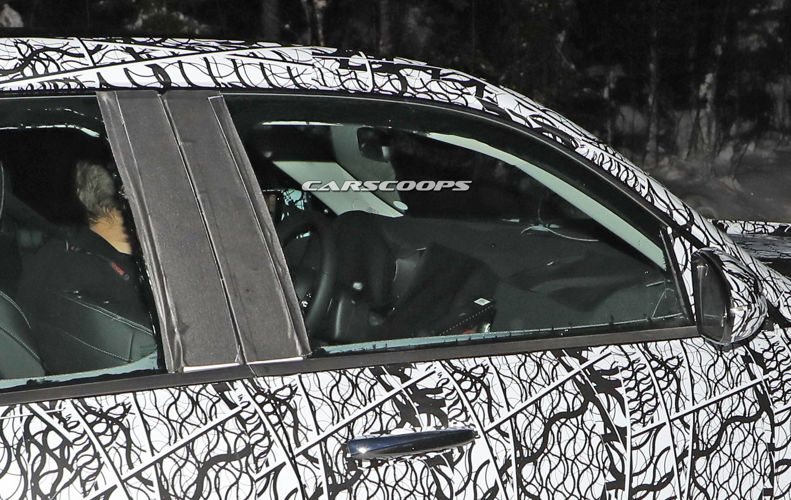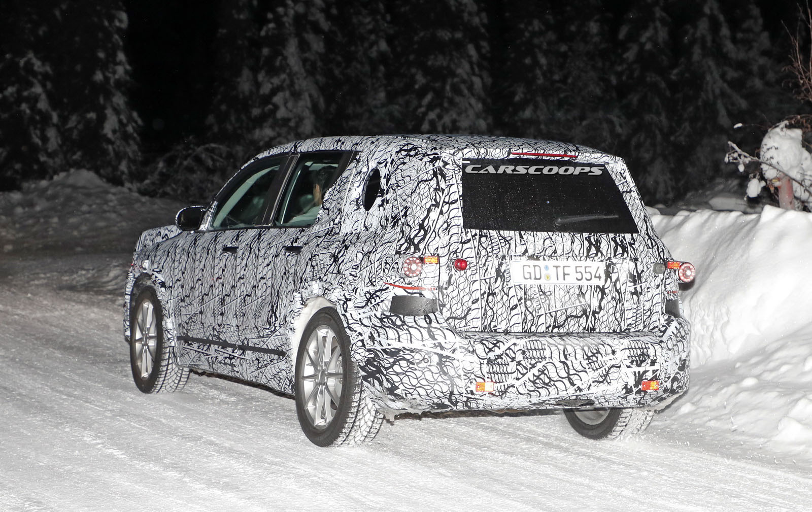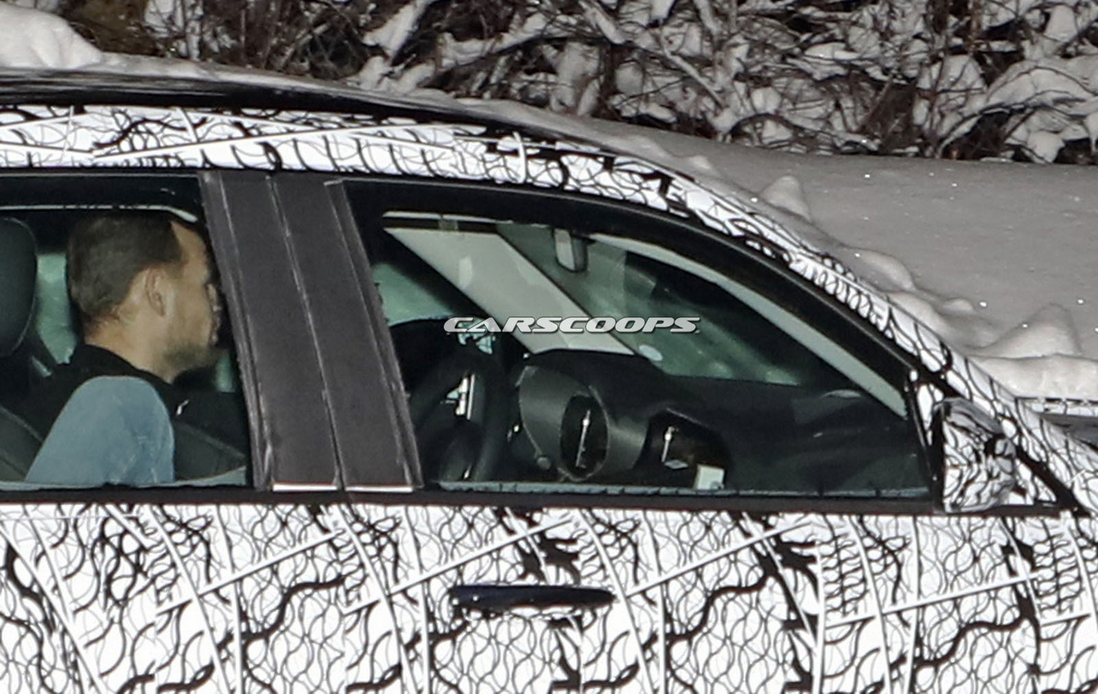 The test car was spotted undertaking some cold-weather testing, wearing a heavy camouflage that includes not only the usual swirly wrap, but also fake body extensions on areas like the bonnet and the rear roof section in a bid to keep its true shape under …wraps.