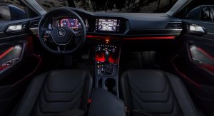 The Jetta’s cabin has gone from clinical to more upscale thanks to higher-quality materials, 10-color ambient lighting that wraps around the interior, and funky trapezoidal design pieces – like the vents. The redesigned center stack now features a larger screen – exact dimensions haven’t been released yet – that’s angled towards the driver and perched higher up on the dash. VW’s new, highly-configurable Digital Cockpit replaces the sedan’s regular instrument cluster on high-end trims.