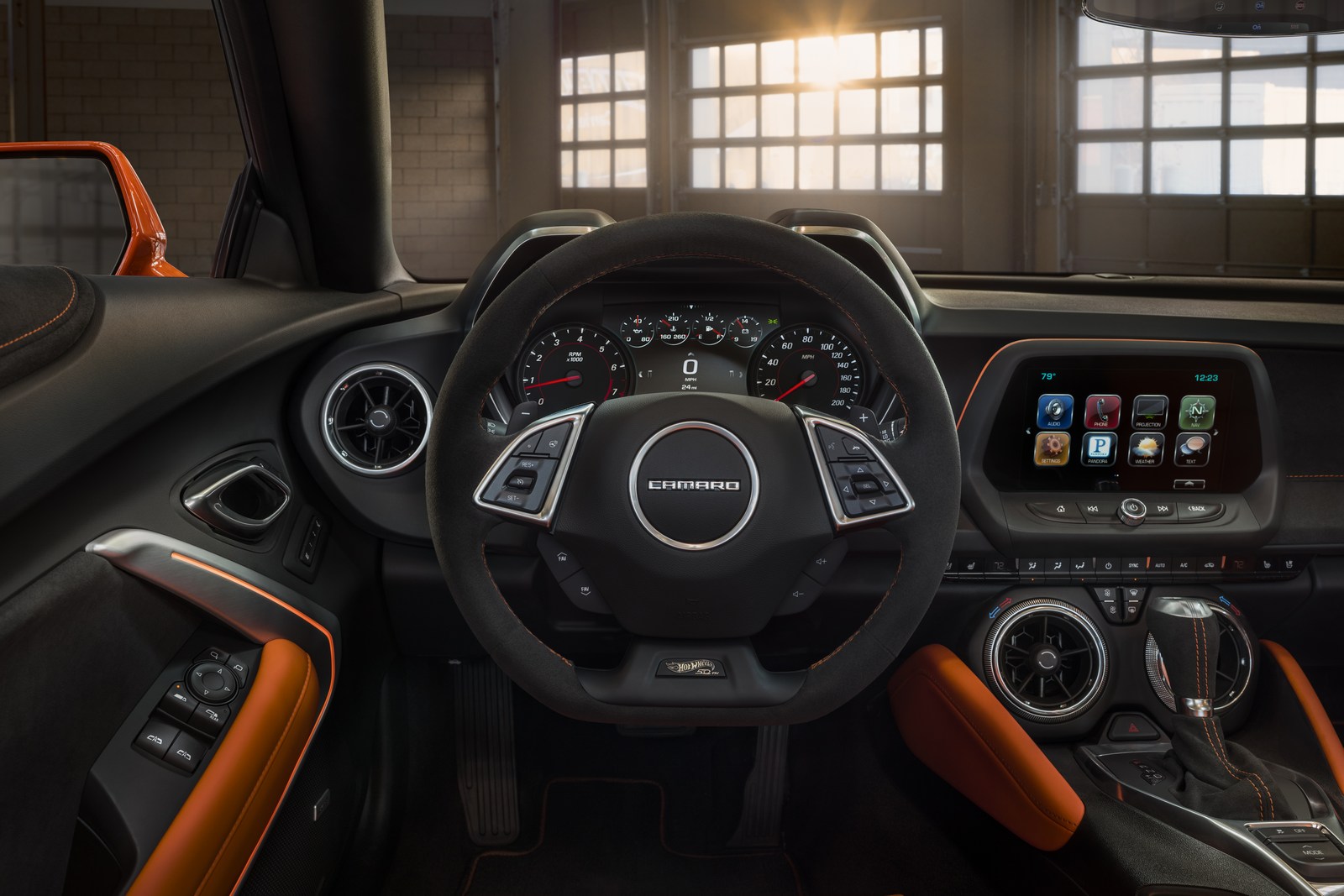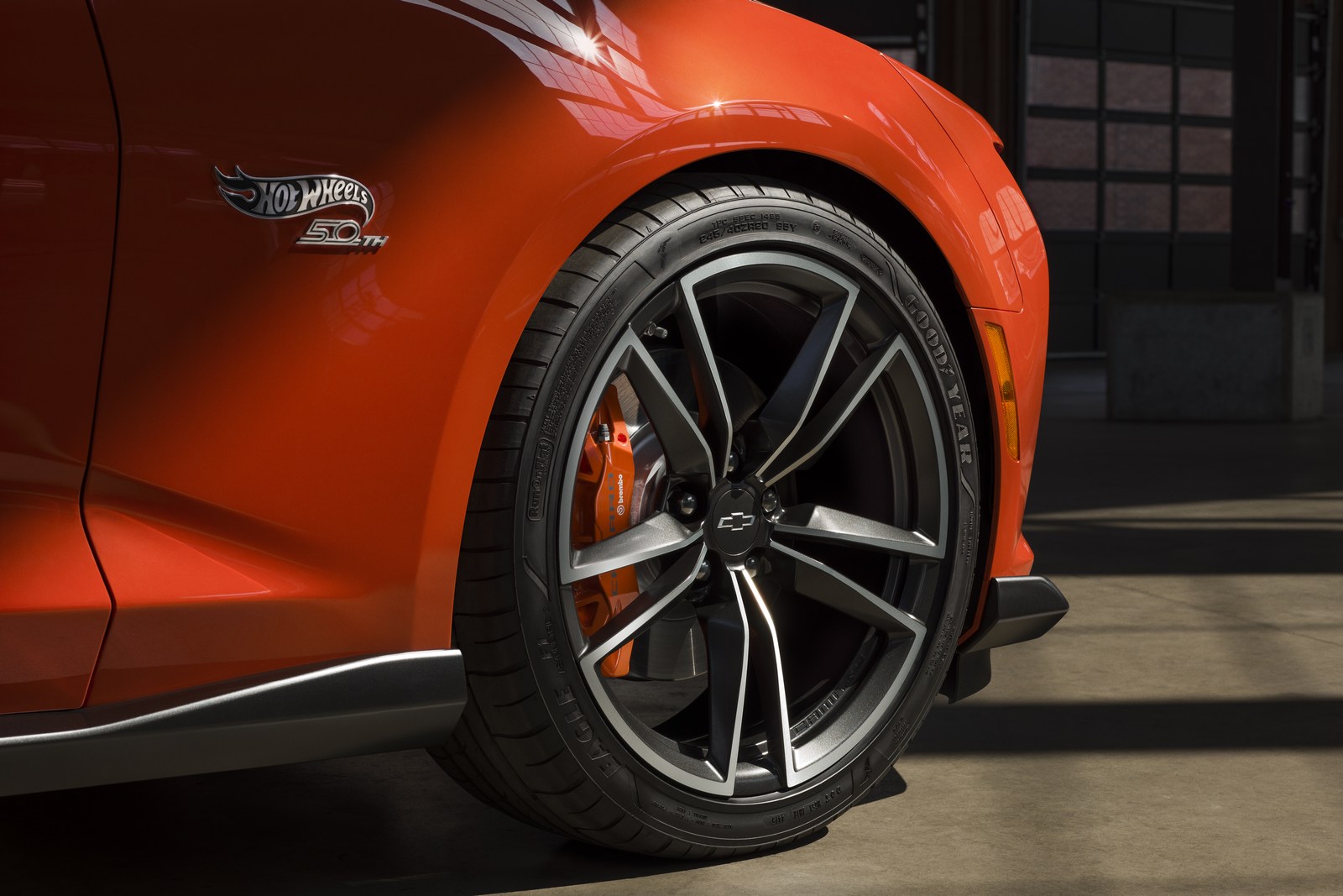 The interior largely carries over from the regular Camaro, but there are a handful of touches that separate the special edition from the standard model. These include illuminated doorsill plates, orange kneepads, two-tone leather seats, special floor mats with orange stitching and a 50th Anniversary Hot Wheels badge on the steering wheel.