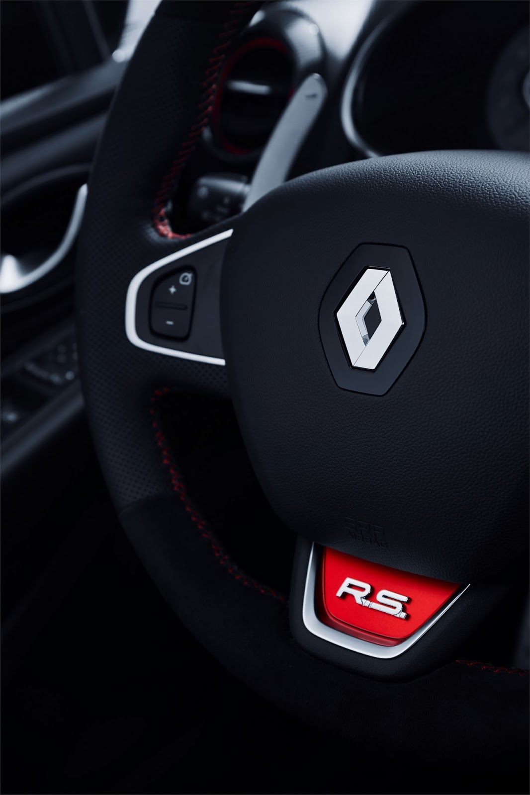 Open the door of the new Renault Clio R.S. 18 and you will be greeted by several updates, such as the numbered R.S.-branded door sill, Alcantara and leather trimmed steering wheel, carbon fiber-effect air vent surrounds, and special Renaultsport carpet mats.