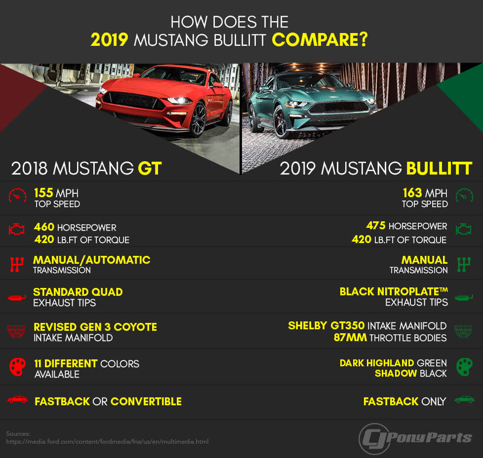 But as this chart, courtesy of CJPonyParts, shows, the devil is in the details when it comes to the Bullitt. In other words, it’s the little things that make it stand out not just from the GT, but from any other Mustang currently on sale.