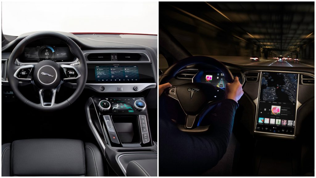 Both of their interiors look futuristic, with the Tesla offering simpler lines and that massive infotainment screen that controls everything and the Jaguar showing off a more sculpted dashboard and the company’s latest duo-display system.