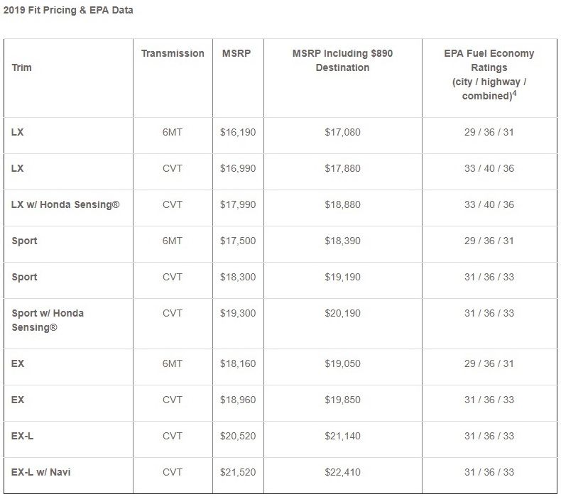 The engine remains unchanged, meaning a 1.5-liter i-VTEC four-cylinder unit with 130hp and 114 lb.-ft. of torque. The 2019 Honda Fit carries an EPA fuel economy rating of 29/36/31 mpg (city/highway/combined)3 for the manual transmission, and 33/40/36 mpg for CVT models.