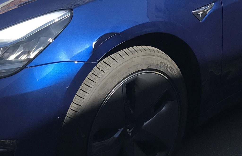 When Chris Boylan of Clean Technica accidentally clipped a parking sign backing out of a parking space with his brand new Model 3, he expected to pay a few hundred dollars in order to fix the 4-inch dent on the front left fender.