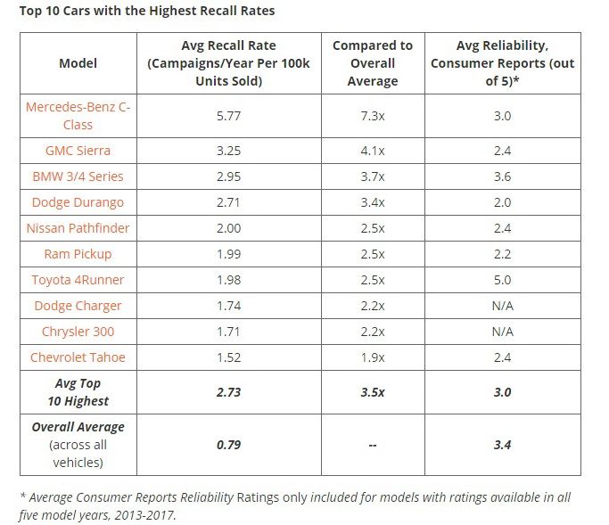 The GMC Sierra finished second behind the C-Class. It also had many recall campaigns for things like faulty seat belts, loss of power in steering, brake pedals becoming inoperative, and fuel tanks overfilling, among other.