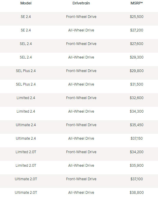 Power is provided by a 2.4-liter four-cylinder engine which produces 185 hp (138 kW / 187 PS) and 178 lb-ft (241 Nm) of torque. It is connected to an eight-speed automatic transmission which can be paired to an optional all-wheel drive system for an additional $1,700.