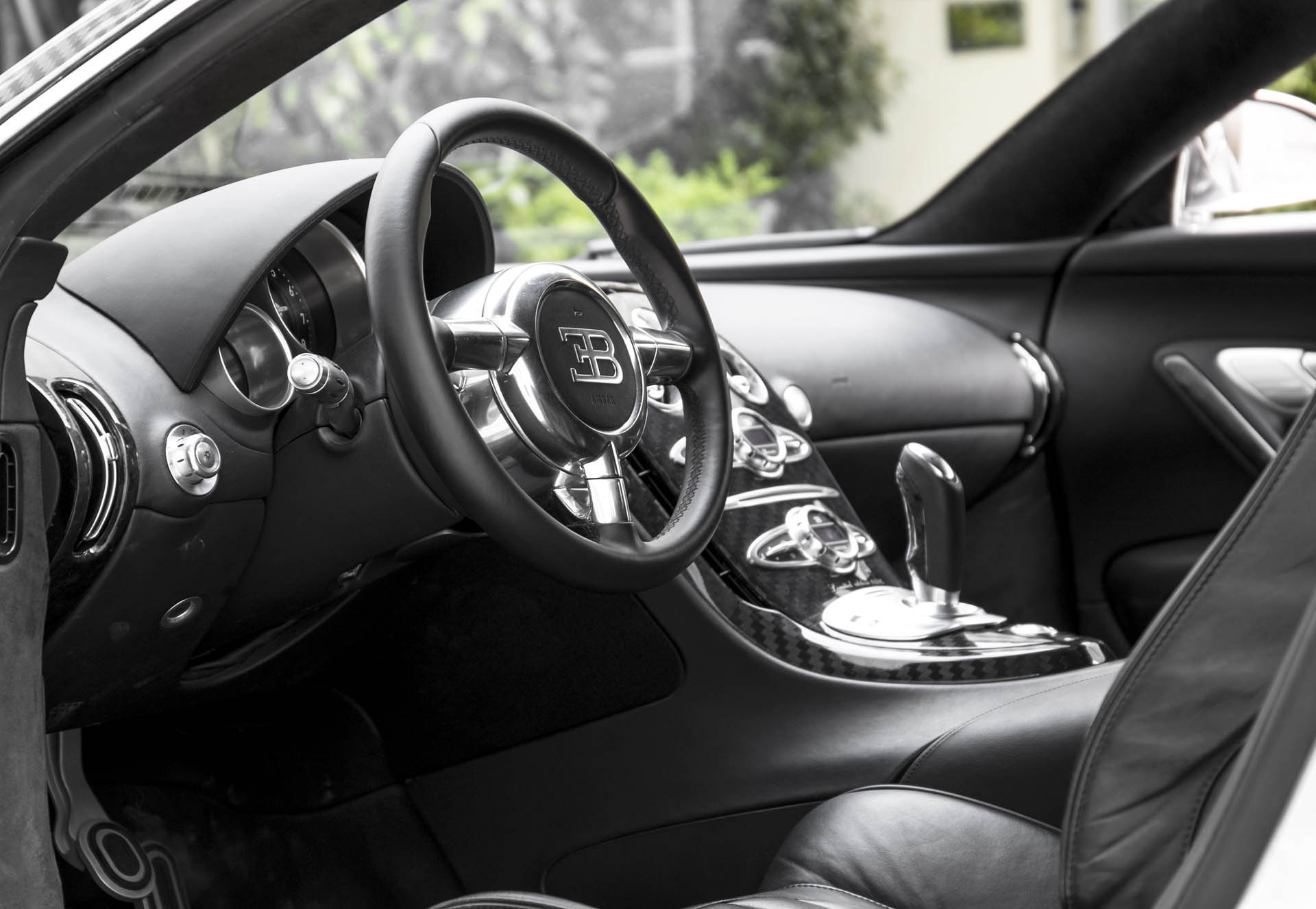 This Bugatti is decked out in a combination of chrome and bare black carbon fiber that’s hardly what you’d call “subtle,” by any stretch of the imagination, but somehow makes other Veyrons look somewhat overwrought (to our eyes, at any rate). It’s so devoid of color that we’d almost think the photos were desaturated to the point of black and white, if not for the red emblem and tail lights.