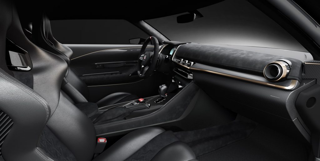 The GT-R50’s new bodywork gets a distinctive gold detailing, a new hood with a more pronounced power bulge, thin LED headlights, a lower by 54mm roofline, a steeper rake for the rear window and twin floating taillights with hollow centers, among other.