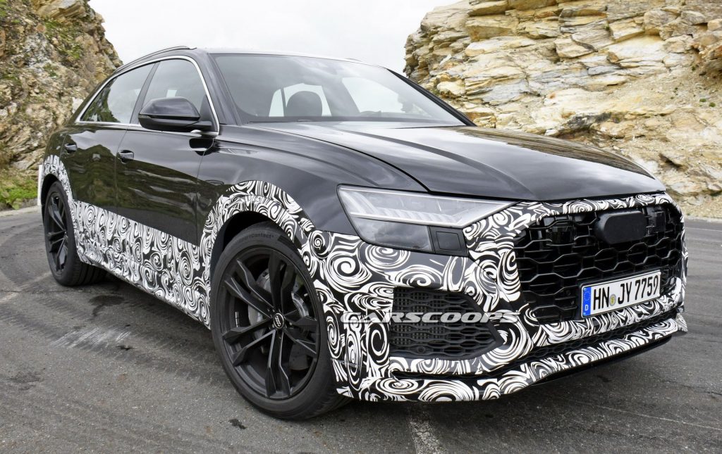 Since the new Audi Q8 has already been revealed in full, there’s no reason for the hot RS Q8 test car to continue wearing a full swirly body wrap, thus giving us a first proper look at its muscular bodywork.