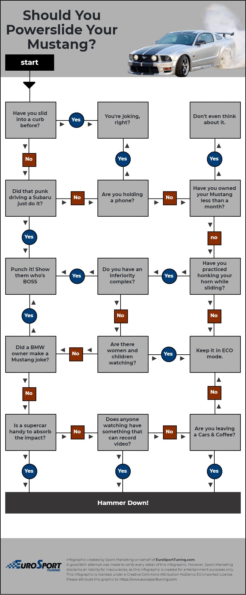 Now, there is hope for all of these Mustang drivers, as the team at EuroSport Tuning came up with just the thing: The ‘Should You Powerslide Your Mustang? Decision Tree’.