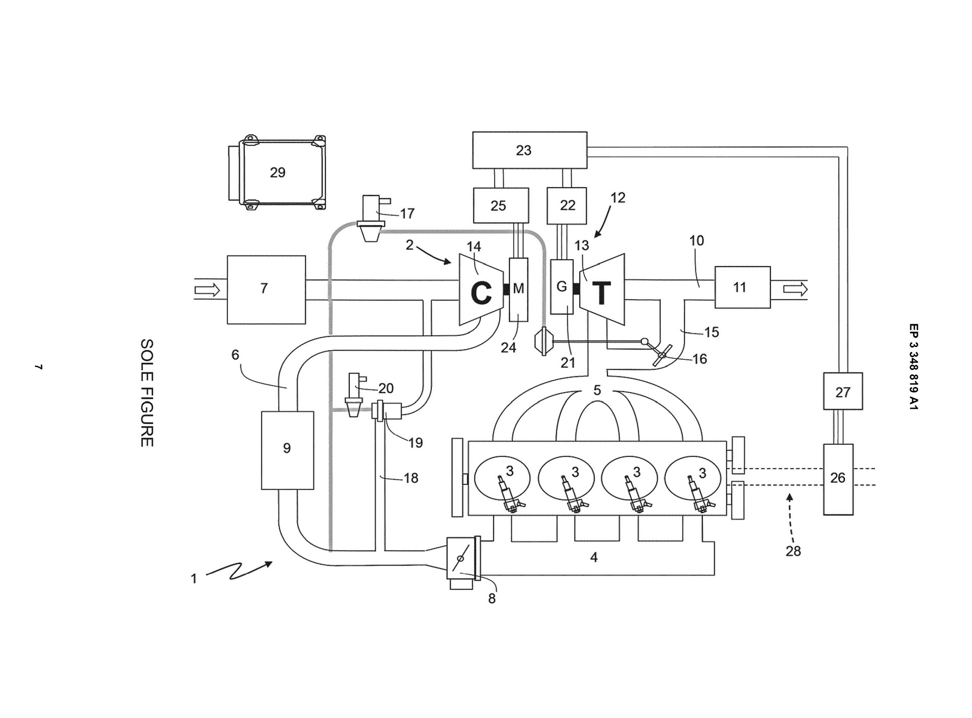 According to the application to the European Patent Office (hat tip to AutoGuide), Ferrari has designed a turbo system that has the turbine inserted into the exhaust duct, where it’s driven by the exhaust gases but the turbine wheel has no mechanical connection to a compressor.
