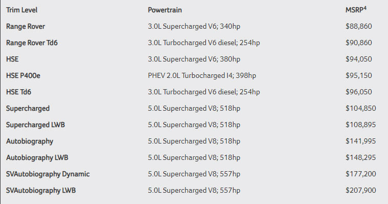 Since the Range Rover recently received a facelift and an updated interior, this year’s changes are relatively minor. However, the big news in the addition of the Range Rover HSE P400e.