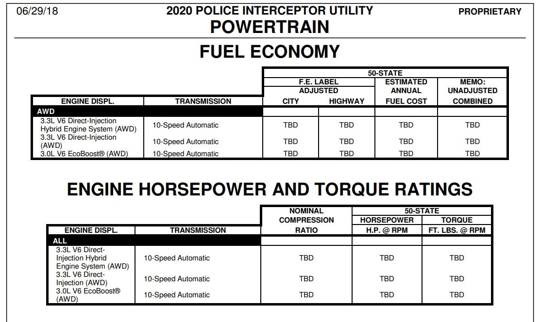 The ordering guide (PDF), which was posted on Explorerforum.com and picked up by Jalopnik, reveals the Police Interceptor Utility will be offered with three different engines including a 3.0-liter EcoBoost V6, a 3.3-liter V6 and a hybridized version of the 3.3-liter V6. The latter is the most interesting of the bunch and the document says the hybrid model will come equipped with a ten-speed automatic transmission, a lithium-ion battery pack and a high-performance regenerative braking system which is specifically calibrated for police duty.