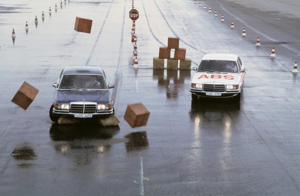 ABS was originally presented from August 22 to 25 in 1978 by Mercedes and Bosch, before becoming available -for the first time in a production car- in the W116 S-Class at the end of 1978.