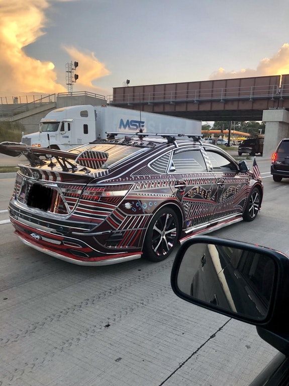 Other mods include the wheels, which have been customized to match the exterior of the vehicle, the weirdly tinted windows and an American flag strapped to the front fender. Speaking of the front, we can only imagine what’s going on over there – unfortunately this was the only angle available.