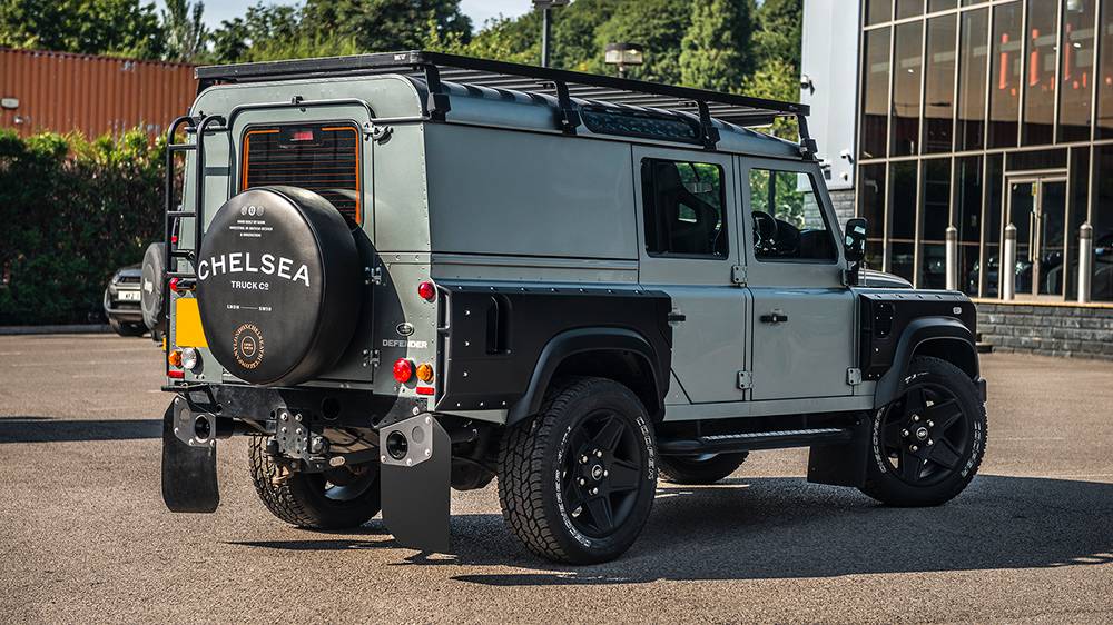 The bodywork features a custom Volcanic Mist Satin paint that contrasts with the black fenders, wheels, and front grille. The pimped-out Defender also sports a black bumper with integrated lighting and skid plate, as well as a massive roof rack. Rounding off the styling tweaks is a Chelsea Truck Company spare wheel cover.