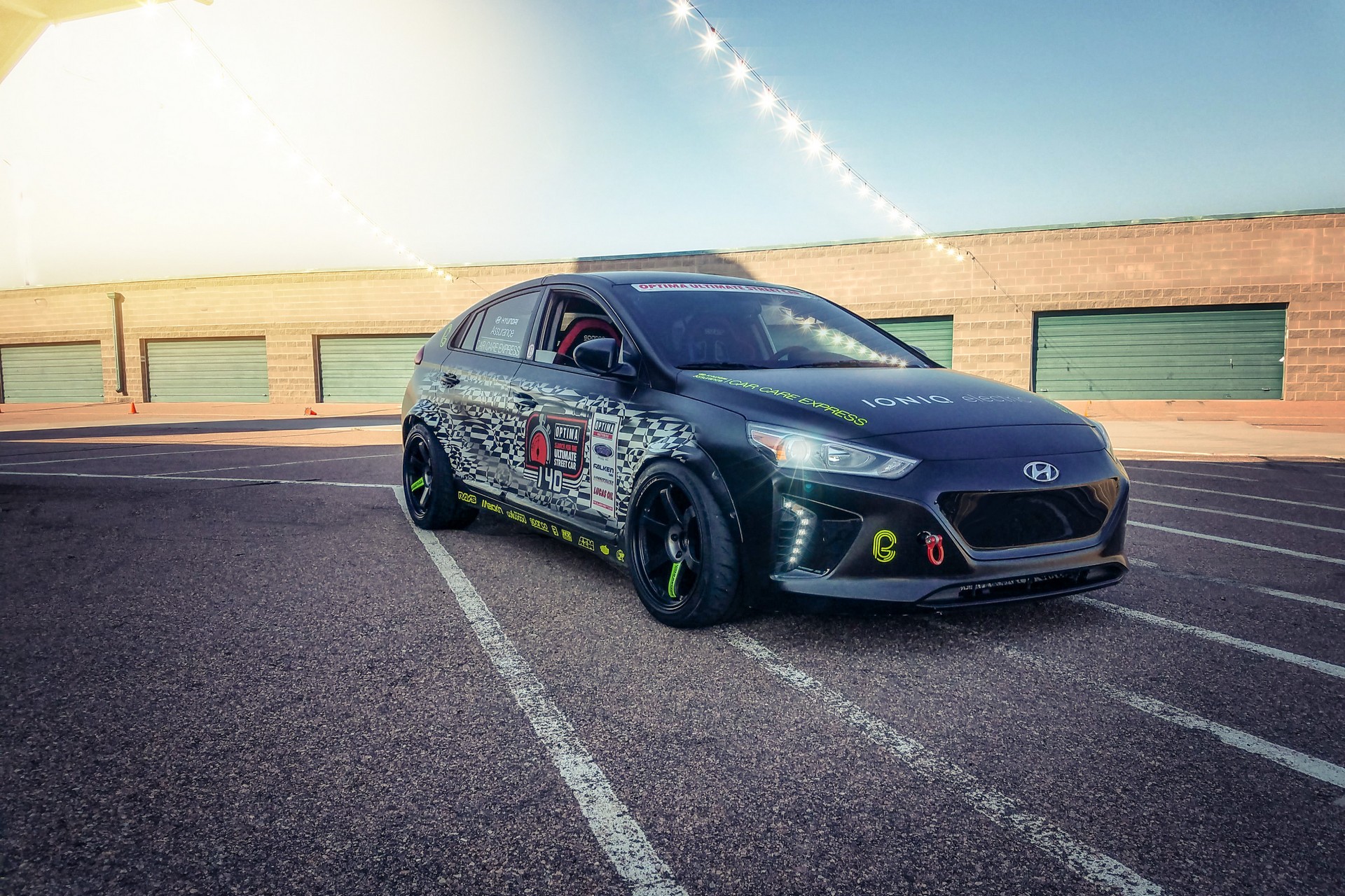 Besides the new electric motor, the Ioniq has been equipped with a limited slip differential and a Wilwood braking system. Other upgrades include lowering springs, cooling upgrades and 18-inch Volk Racing Wheels with Bridgestone tires.