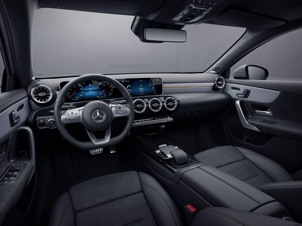 Moving on to the interior, the A-Class Sedan Edition 1 brings sports seats upholstered in Artico man-made leather/Dinamica microfiber, with contrasting copper trim. Similar contrasting seams can be found on the upper instrument panel, central armrest, and door panels — which are lined with Artico artificial leather.