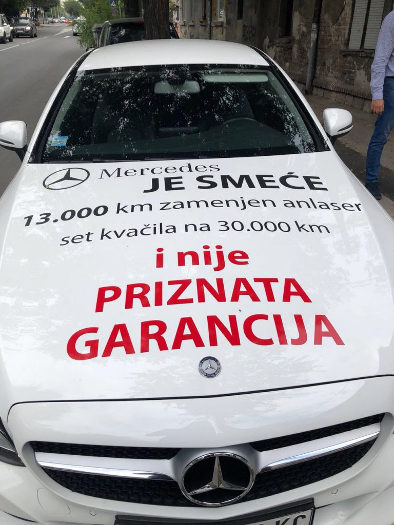 As you can imagine, the texts printed on the car are not very flattering for Mercedes, quite the contrary. The print on the side of the vehicle reads: “Mercedes is trash, 30,000 km clutch set not supported by warranty.”
