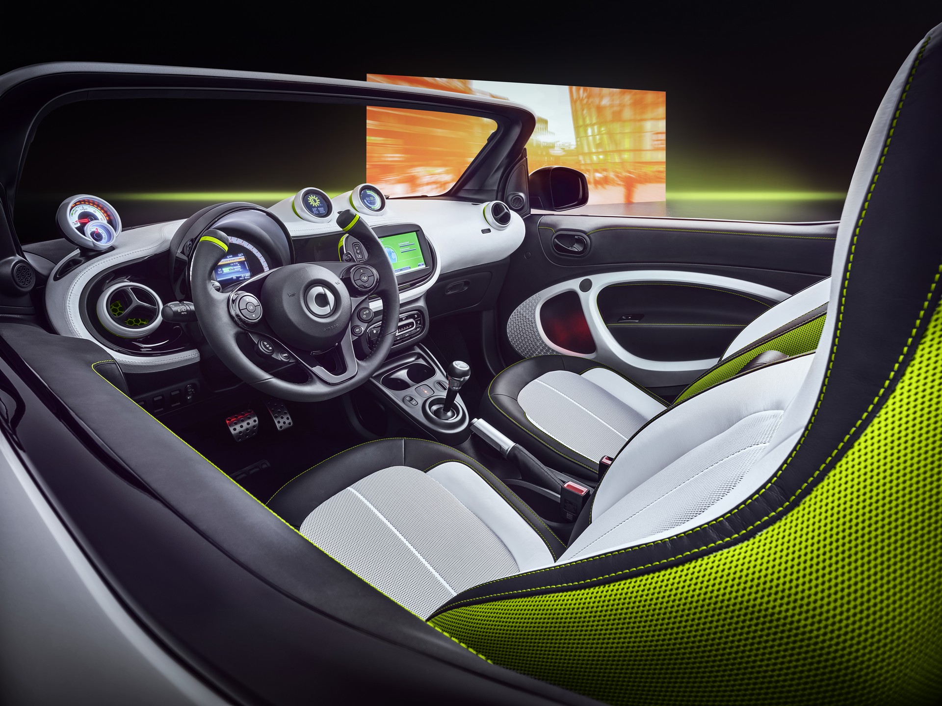 Elsewhere, the concept has stainless steel pedals and green honeycomb inserts in the air vents. Speaking of the latter, two of the vents have been replaced by digital displays which can be used to show information from Smart’s “ready to” app.