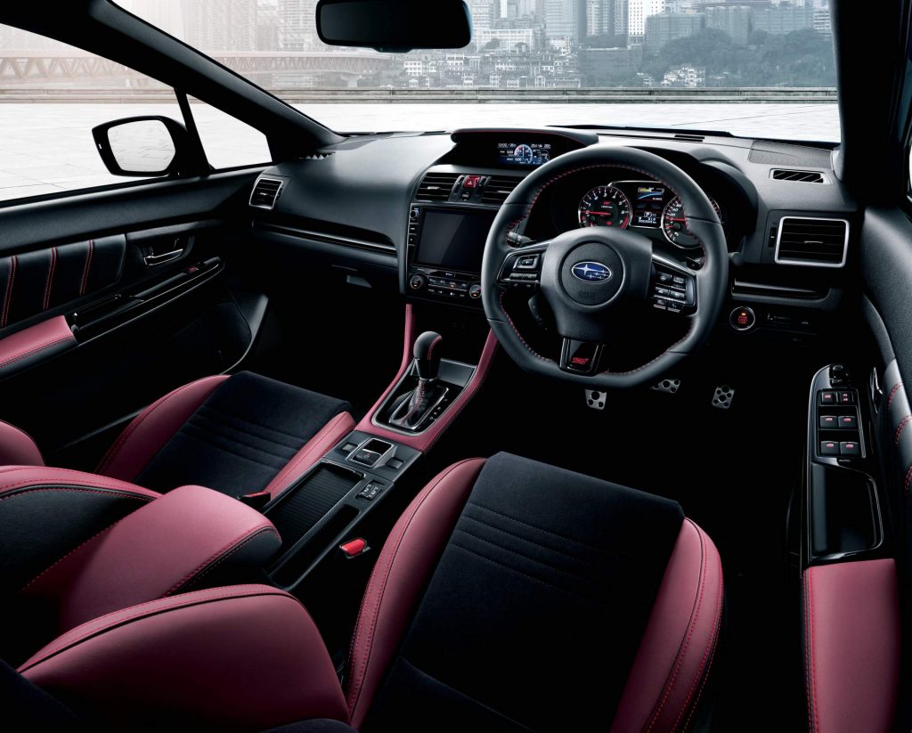 Inside, the range-topping WRX S4 gains Recaro front seats upholstered in Bordeaux leather and ultra suede, leather-wrapped steering wheel with red stitching, stainless steel sill plates, and the STI logo visible all over the place.