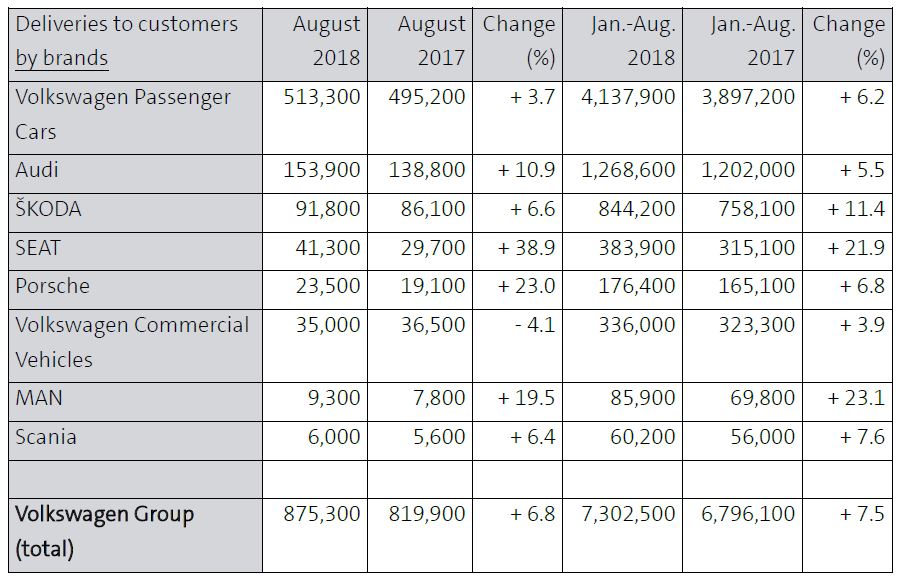 Volkswagen Passenger Cars is still the Group’s best-selling brand, accounting for 4,137,900 units so far this year, up from 2017’s 3,897,200, followed by Audi, with a 5.5 percent increase in sales, totaling 1,268,600 deliveries.