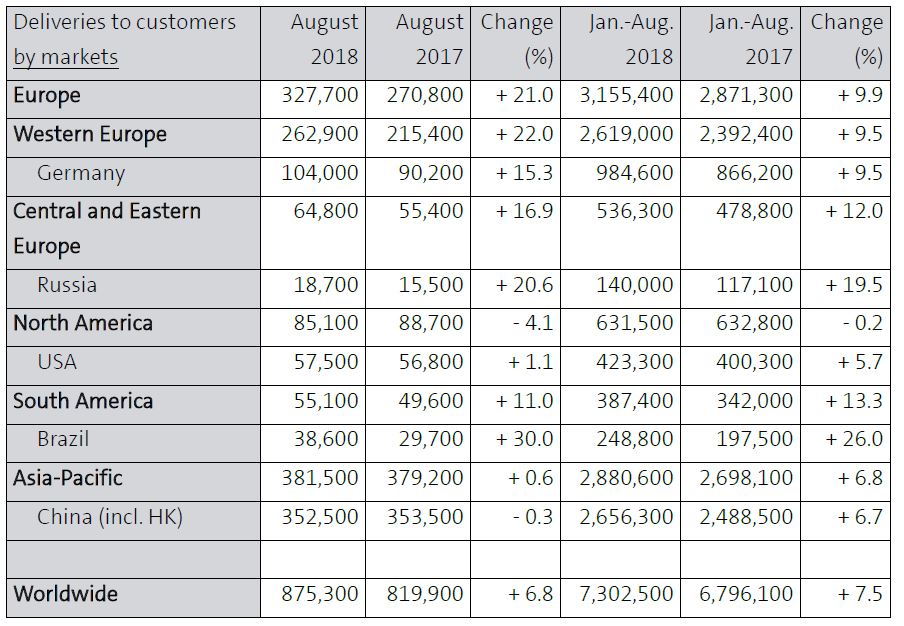 In the first eight months of the year, it sold 7,302,500 vehicles worldwide, a 7.5 percent increase compared to January-August of 2017.