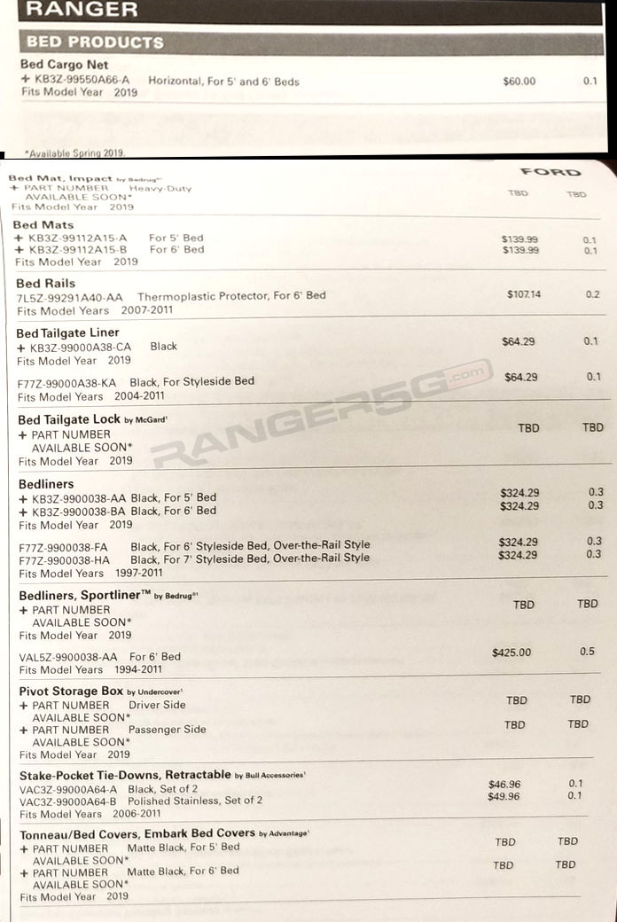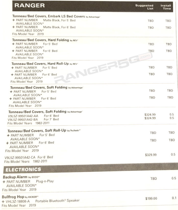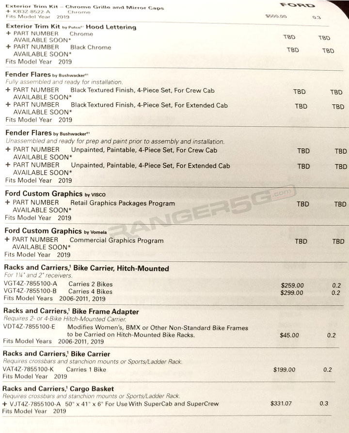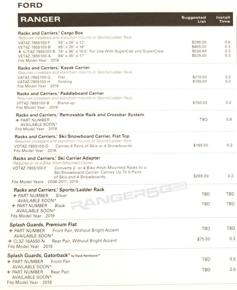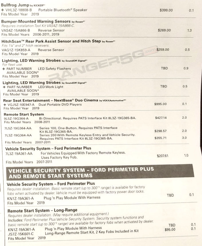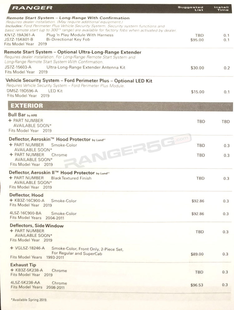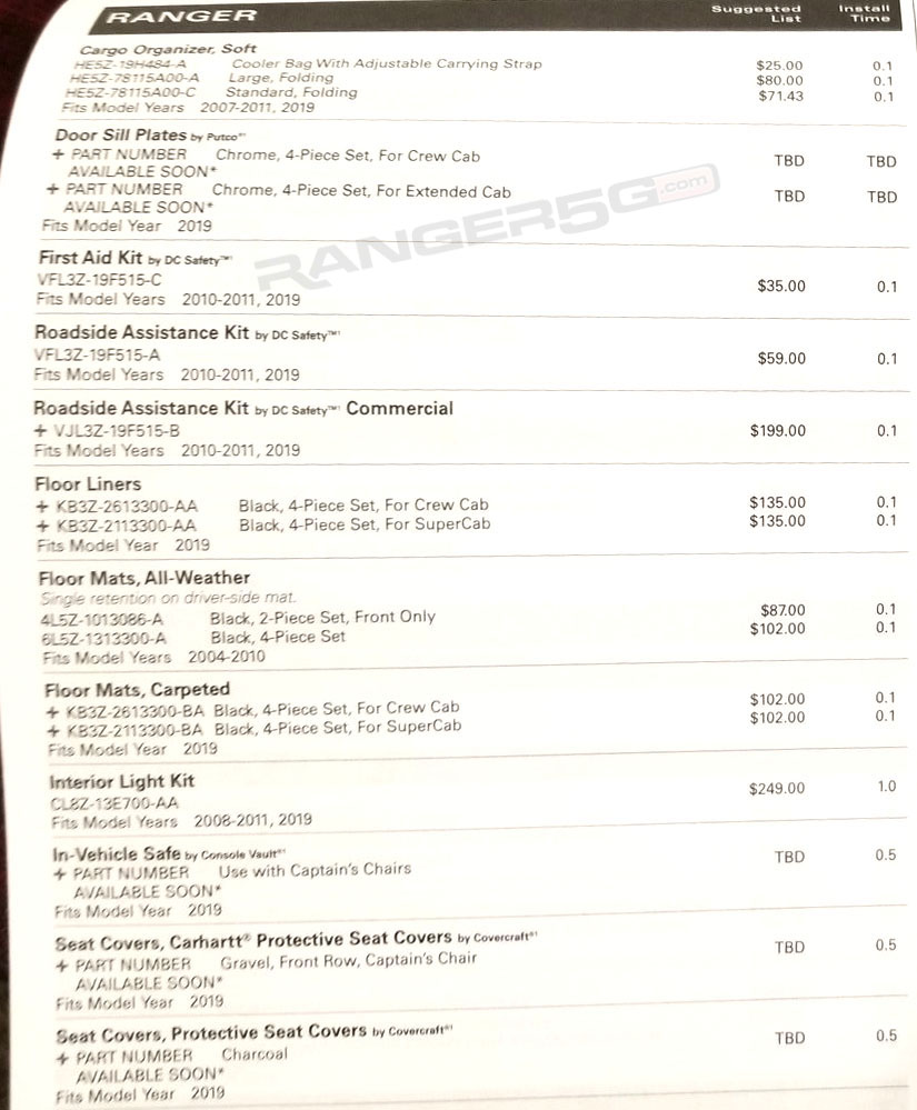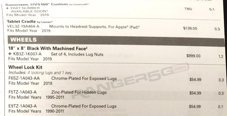 Here’s the list of the optional extras available for the 2019 Ranger, courtesy of Ranger5G.com: