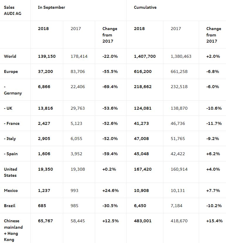 Despite these harsh numbers for September, Audi still expects its year-end deliveries to be at roughly the same level as last year. Also worth noting is that, as of September 1st, legal conditions state that automakers in Germany can only register 10% of their prior-year volume of cars, approved according to the previous NEDC test method.