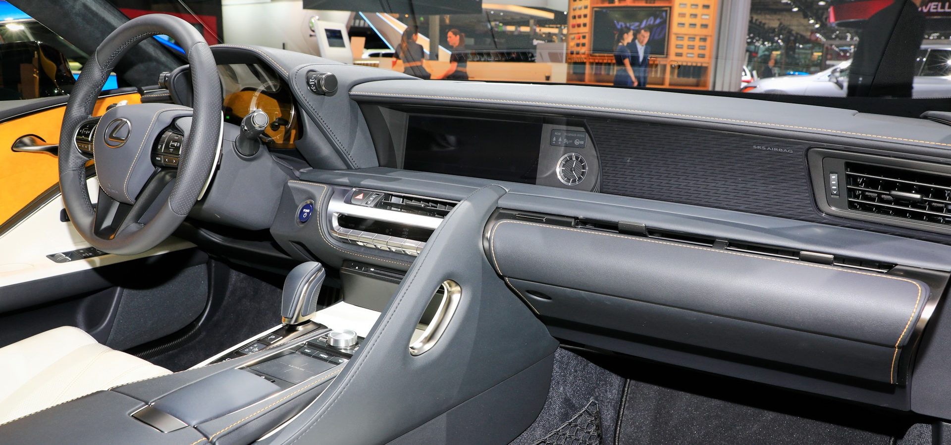There is a very clear theme to the cabin of the LC Limited Edition. There’s yellow leather on the door panels, mixing it up with the Alcantara trim (on the headliner), white leather seats and console inserts, plus loads of yellow contrast stitching. Lexus also used some carbon fiber, although not extensively.