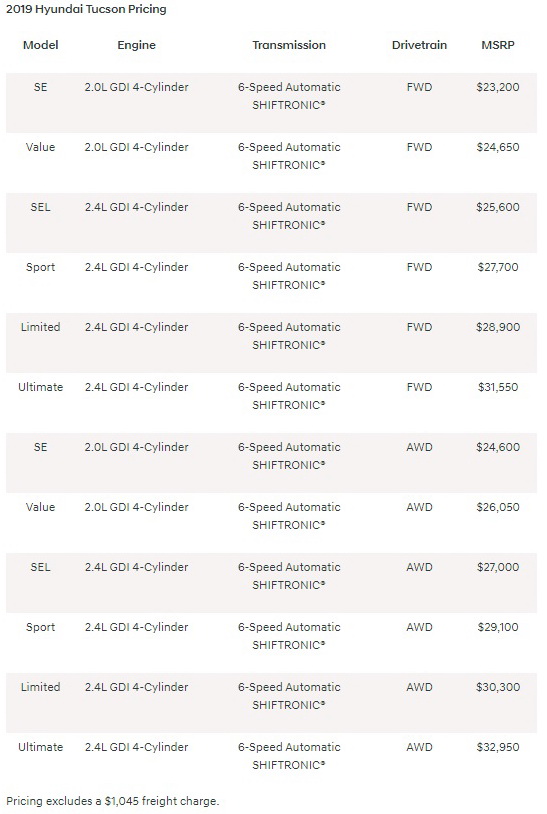 Prices for the 2019 Hyundai Tucson start from $24,245 (including a $1,045 freight charge) for the FWD 2.0-liter SE model. An extra $1,400 will get you all-wheel drive, while the top of the line AWD 2.4-liter Ultimate goes for $33,995.