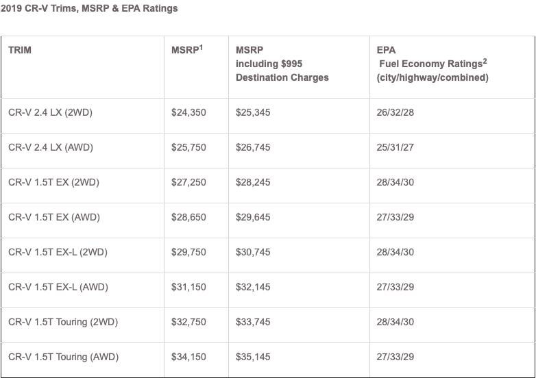 Despite the lack of updates, the 2019 CR-V’s starting MSRP adds $100 over the previous model year. The base Honda CR-V LX with two-wheel drive starts at $24,350, while the LX with all-wheel drive is priced from $25,750.