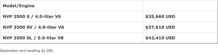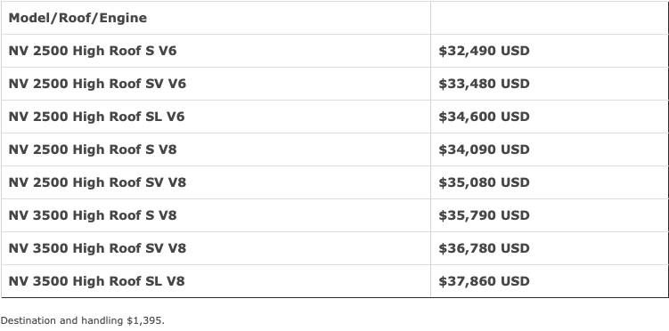 As before, the standard engine is a 261-hp 4.0-liter V6 gasoline unit mated to a five-speed automatic transmission. Both the NV Passenger and NV Cargo are also available with a 375-hp 5.6-liter Endurance V8 unit, linked to a heavy-duty seven-speed automatic transmission.