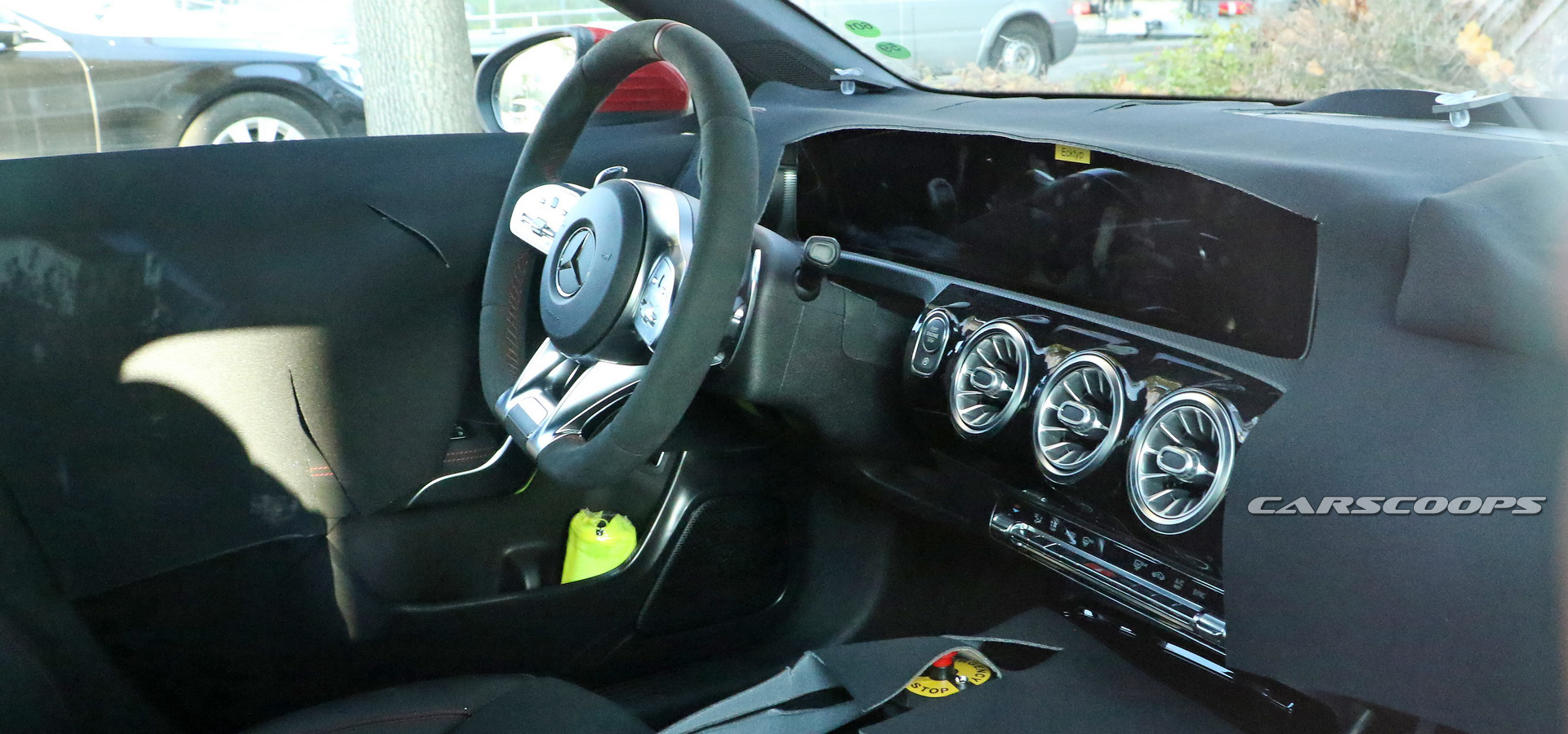 The circular turbine-style air vents are identical to the A-Class’ in both shape and number, as are the climate control commands, dual-screen layout and even the door panels, we suspect. We do see a sporty Alcantara steering wheel, which is a bit odd since this prototype doesn’t appear to be a hardcore AMG version.