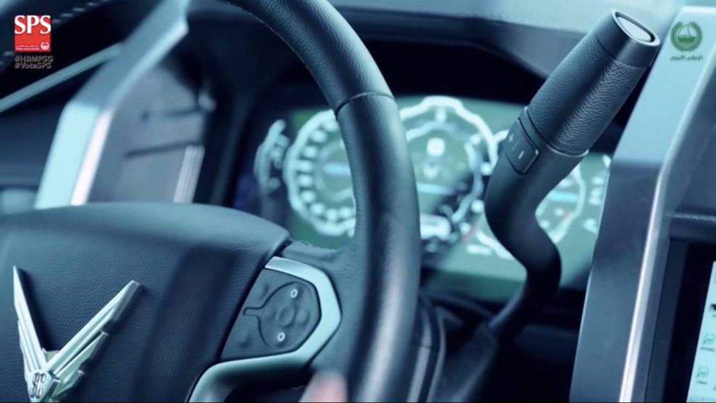 The dashboard is full of touchscreens, including in the front passenger area. This allows one officer to focus on driving while the other operates the onboard systems. There is little information about the vehicle, but we do know the 4×4 patrol car is built by W Motors, maker of the Lykan Hypersport. Safe City Group, an Abu Dhabi-based computer security company, supplies the sophisticated onboard systems.