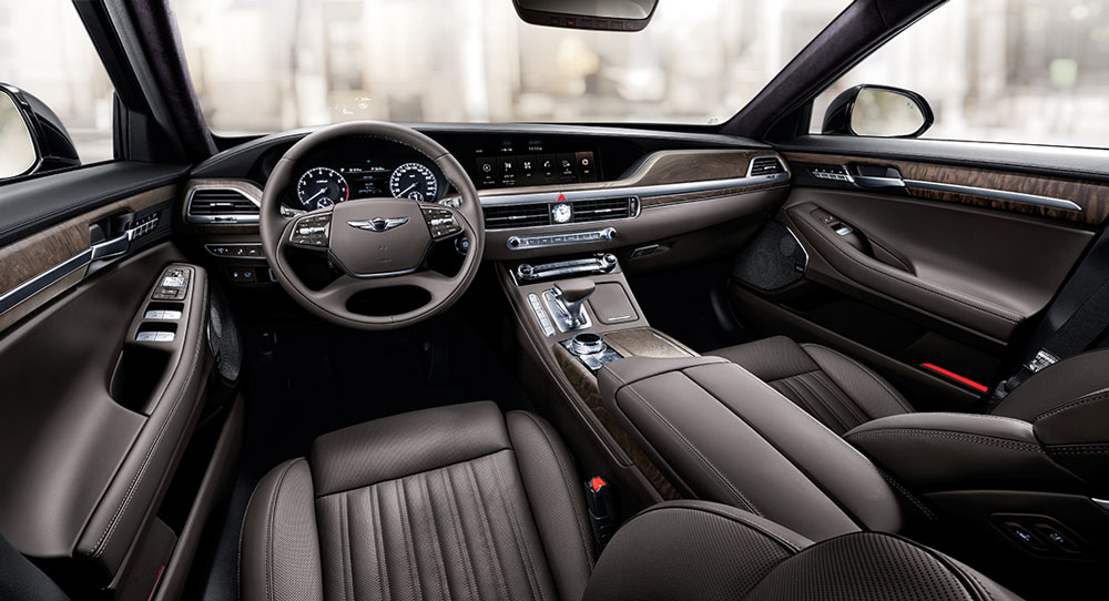The side turn signals ‘split’ the headlights in two, there are new exhaust tips and optional 19-inch wheels with sound absorption to reduce tire noise. Genesis is offering the 2020 G90 in nine exterior colors, including the new Porto Red and Gold Coast Silver, and new two-tone color and trim combinations, namely Brown and Brown/Blue.