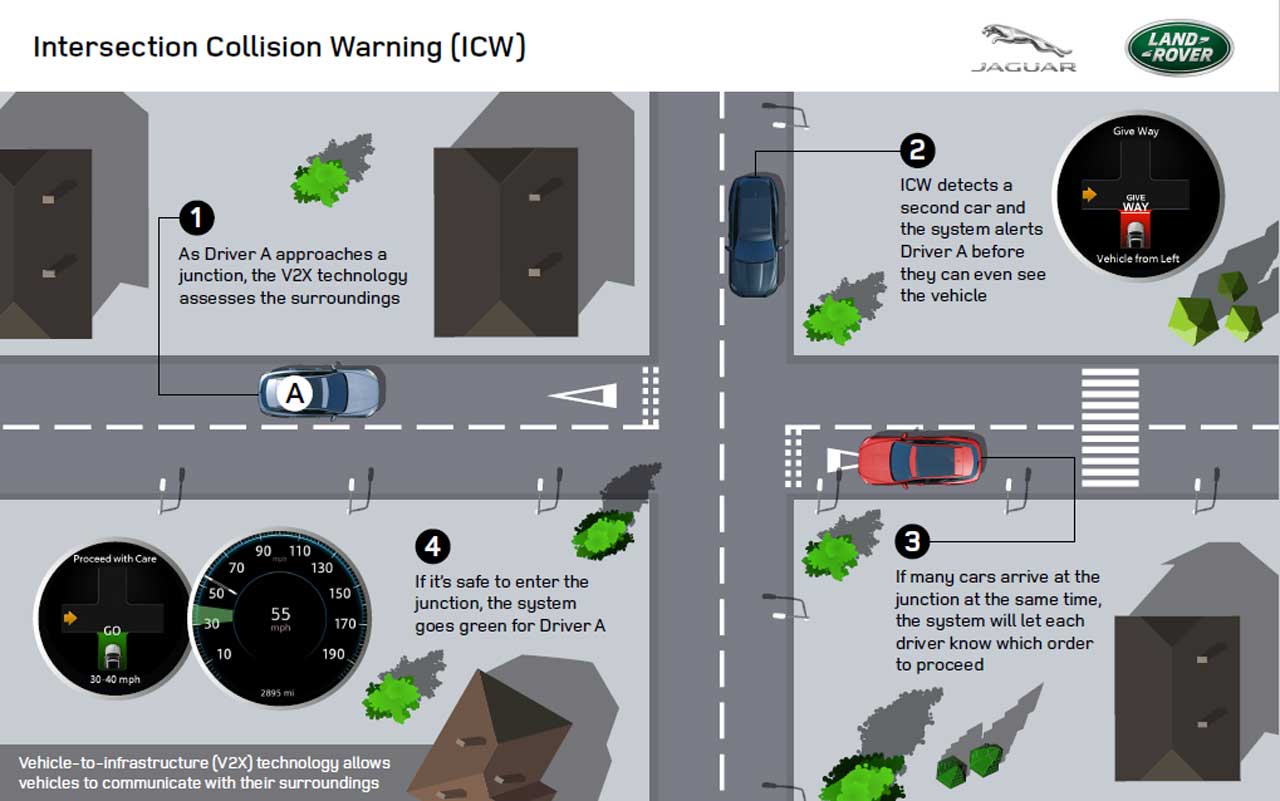 Since partnering with the UK Autodrive project three years ago, JLR has developed such systems as Intersection Collision Warning (to alert the driver of potential dangers at junctions), Intersection Priority Management (to help multiple vehicles determine who has the right of way), Emergency Vehicle Warning (to alert of arriving police cars, fire trucks, and ambulances), Collaborative Parking (to provide real-time info on available parking spaces), Electronic Emergency Brake Light (to display when the vehicle in front suddenly brakes), and In-Vehicle Signage (that could replace expensive overhead road-condition warning systems).