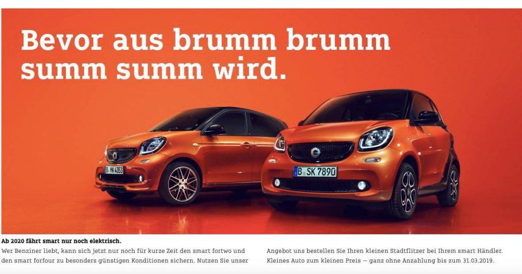 Smart is running a radio and web campaign in Germany called “Secure the last petrol engine now.” That makes it pretty clear that the company will stick to the plan announced earlier this year.