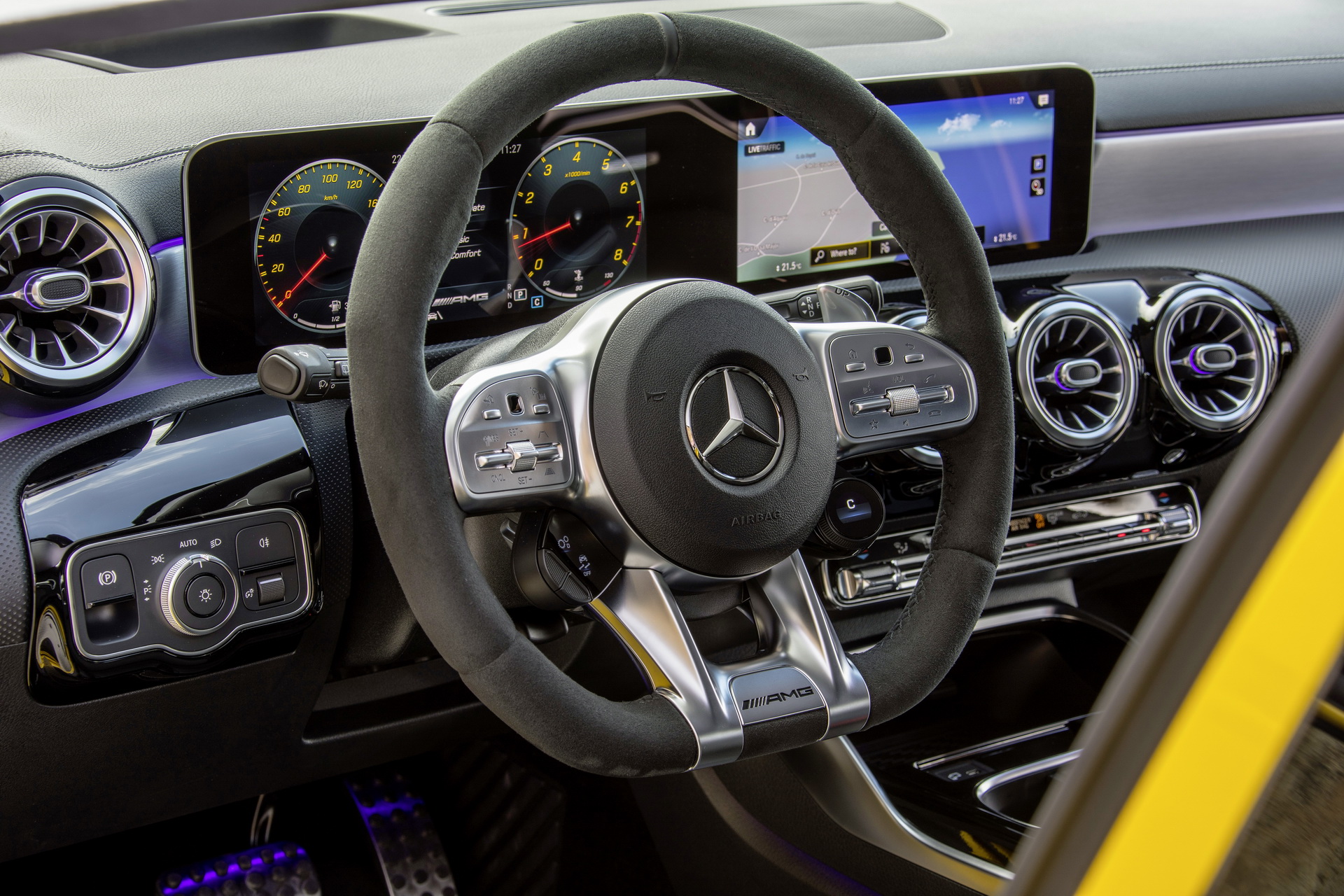 Add to that AMG’s Ride Control adaptive suspension, bigger brakes with four-piston calipers up front and perforated discs, and a speed-sensitive electro-mechanical steering and the fastest A-Class this side of an A45 is ready for action.