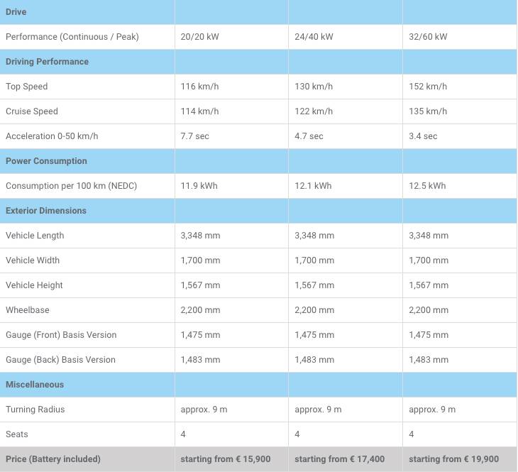 e.Go’s first model is called the Life and is a no-frills city car that offers four-seats inside a slightly shorter bodywork than the Fiat 500‘s and is available in three different battery configurations. The base e.Go Life 20 packs a 14.9 kWh battery that feeds a 20 kW (27 hp) electric motor for an NEDC-measured range of 121 km (75 miles). This version starts from €15,900 ($18,160) in Germany.