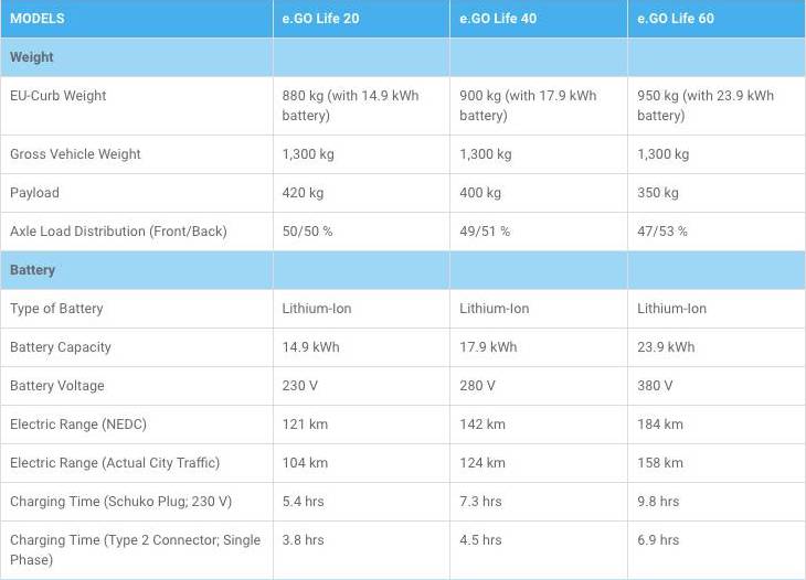 The e.Go Life 40 uses 12.1 kWh battery and a 40 kW (54 hp) motor for a driving range of 142 km (88 miles) and a €17,400 ($19,880) starting price. Finally, the e.Go Life 60 packs a 12.5 kWh battery and a 60 kW (80 hp) motor and offers a range of 184 km (114 miles) for a base price of €19,900 ($22,740).