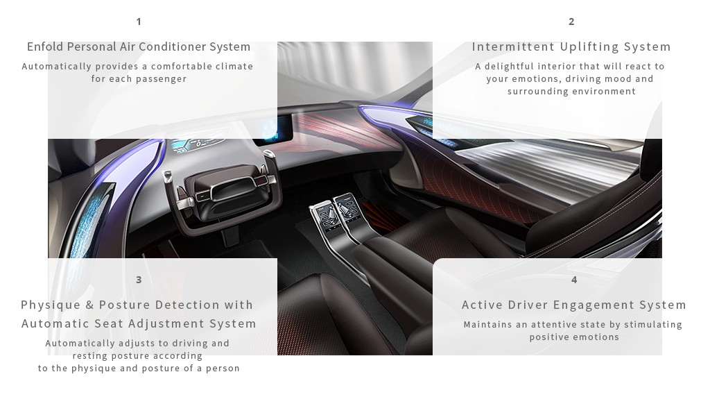 Speaking of comfort, the concept has an enfold personal air conditioning system which monitors the temperature around each individual. If front passenger is cold, the interior will only warm up the area around them.
