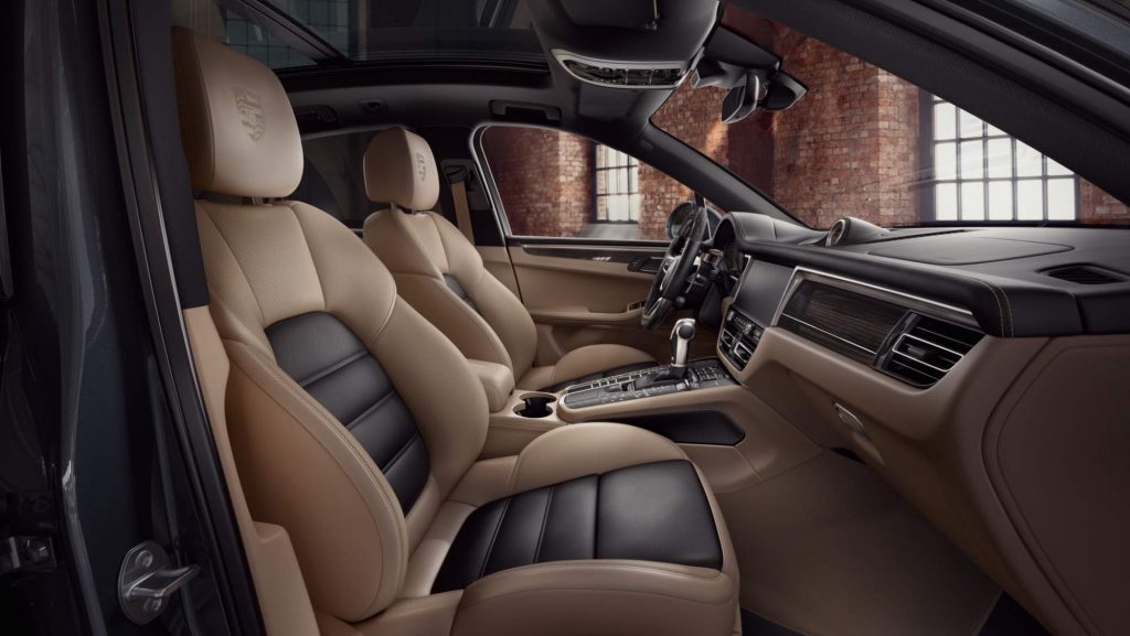 The Porsche Macan S‘ interior gets a consistent upgrade as well thanks to the addition of premium materials as well as uniquely designed and painted components. The cabin’s standout feature is the new bi-color leather package in Black and Mojave Beige. Besides the seats, leather is used on the dashboard, steering wheel, armrests, and even the edging around the floor mats.