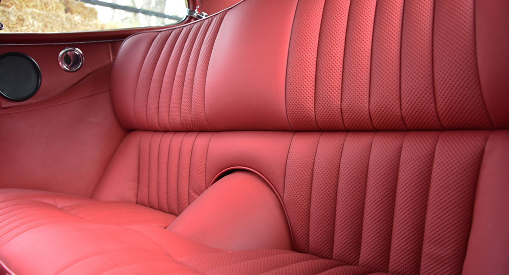 The cabin has been re-trimmed in Oxblood Red leather and fitted with a 15-inch wooden steering wheel and reel seat belts with a classic look. The LED light conversion improves visibility at night and the original stereo system features new internals and offers Bluetooth capability.