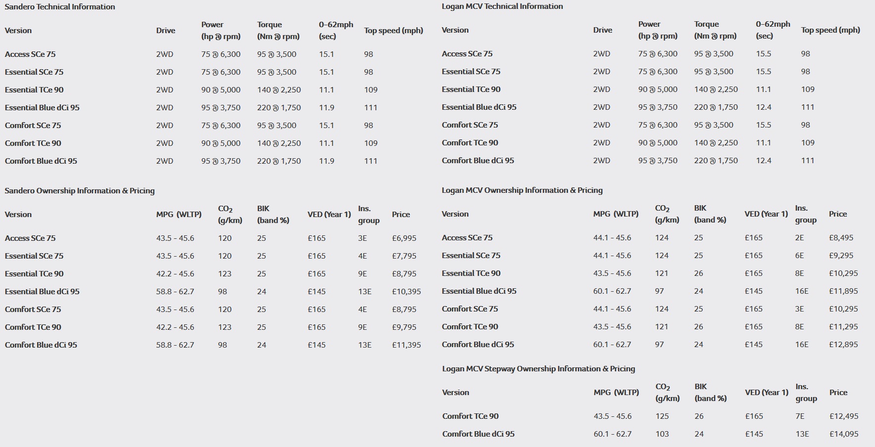 Billed as “the most affordable estate car on sale in the UK”, the Logan MCV is offered in the same Access, Essential and Comfort specs. Pricing starts at £8,495 ($10,926/€9,583), £9,295 ($11,955/€10,485) and £10,295 ($13,241/€11,613) respectively, and each of the three specs mirrors the equipment lineup offered in the Sandero, with a few small exceptions, such as the added Hill Start Assist in the base model.