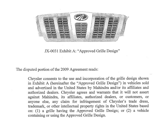 The issue was eventually brought up with the United States International Trade Commission and they determined that the 2009 agreement, which featured an image of the approved grille design, removed “any ambiguity about the specific grille design that Chrysler permitted Mahindra to use.” The commission also noted the agreement did “not contain any language allowing for variations on the grille design.”