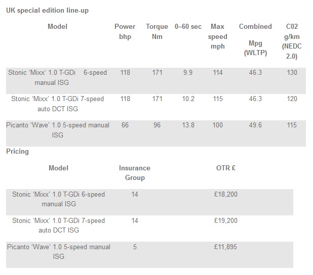 Kia has launched two new special editions of the Stonic crossover and Picanto city car in the United Kingdom, called the Mixx and Wave respectively.