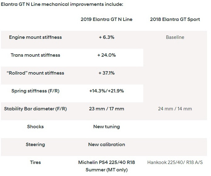 But the most important upgrades are the ones hiding in the chassis. Hyundai says the new Elantra GT N Line comes with stiffer mounts for the engine and transmission, different stability bars front and rear, retuned shocks accompanied with stiffer springs, recalibrated steering and more. The brake rotors are also bigger in diameter.