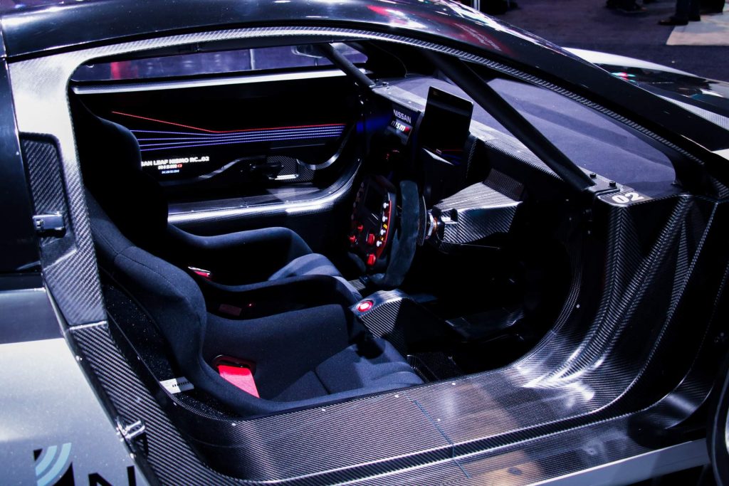 Factor in the low weight of 2,690 lbs (1,220 kg) made possible by the carbon fiber monocoque chassis, and the electric racer goes from 0 to 100 km/h (0-62 mph) in 3.4 seconds, a 50 percent improvement over the previous-gen Leaf Nismo RC.