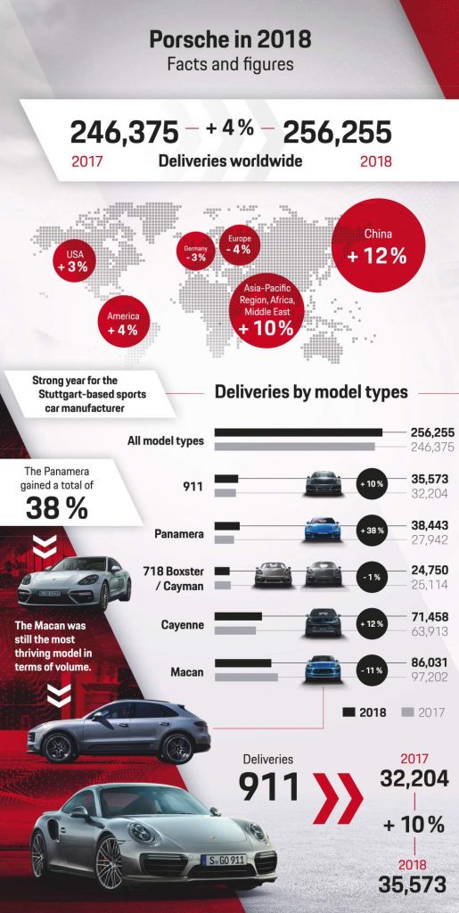 In terms of countries, China was once again Porsche’s largest individual market with 80,108 deliveries (+12 percent). In second place was the United States with 57,202 vehicles (+3 percent). Germany came third with 28,317 units (-3 percent).